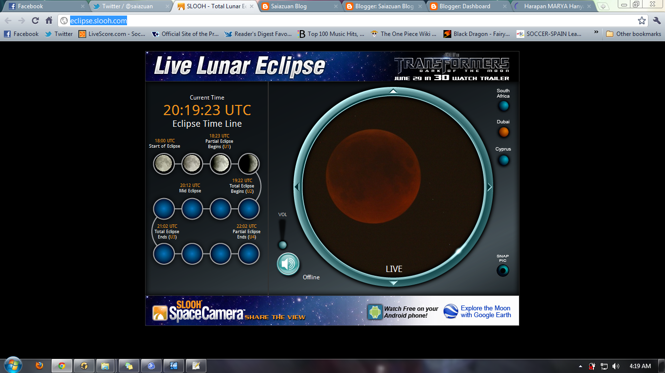 Pada yang terlepas tengok salah satu keindahan ciptaan Allah, Lunar Eclipse, boleh tengok printscreen yang aq ambek kat bawah ni, dari laman web http://eclipse.slooh.com/.. Aq stay up dari kul 2 sampai 6 pagi untuk screenshot2 ni ;D